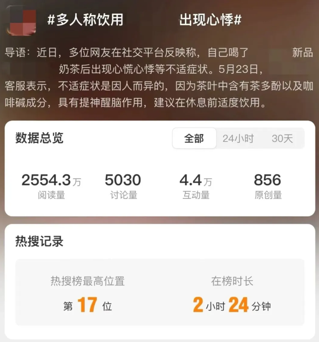 奶茶可谓是“不过气”的网红饮品,越来越多的品牌IP应运而生,而其中一家最近大火的奶茶品牌推出的新品,却被很多消费者反应喝了以后会出现心悸的症状,相关话题持续霸榜热搜。